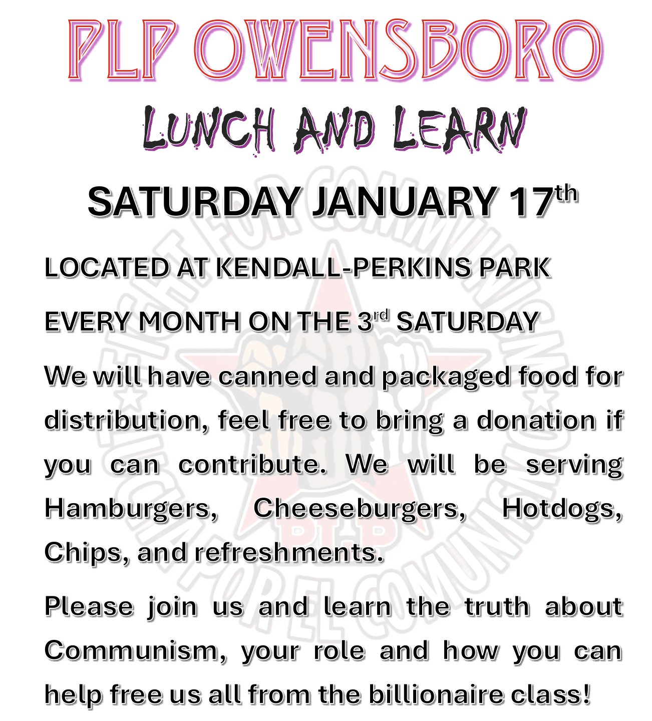 We will host a lunch and learn on the 3rd saturday of every month at Kendell-Perkuins Park in Owensboro, KY.